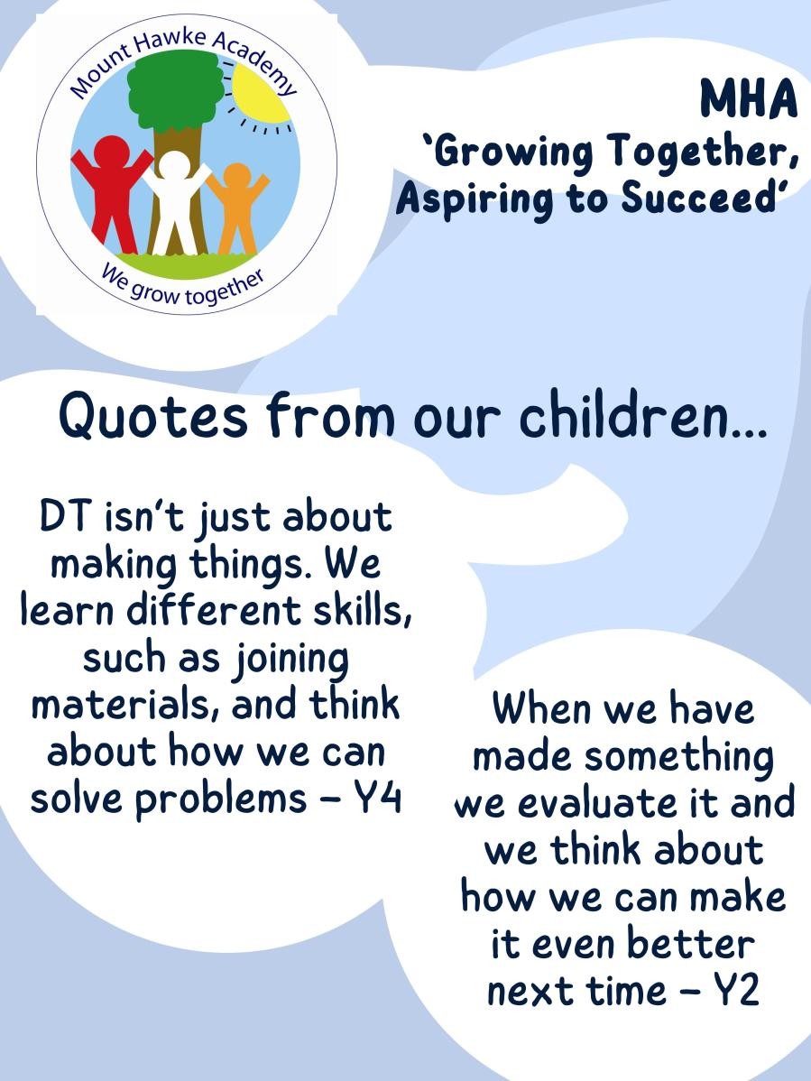 Children will be given opportunities to explore new materials, tools, mechanisms and designs, and will be encouraged to explore all of these to find both their potential and their limitations. Each unit of work will have a clear, practical goal as its outcome, accompanied by design criteria against which finished products can be tested and evaluated. Our children will also learn how to use these materials and tools safely and responsibly.