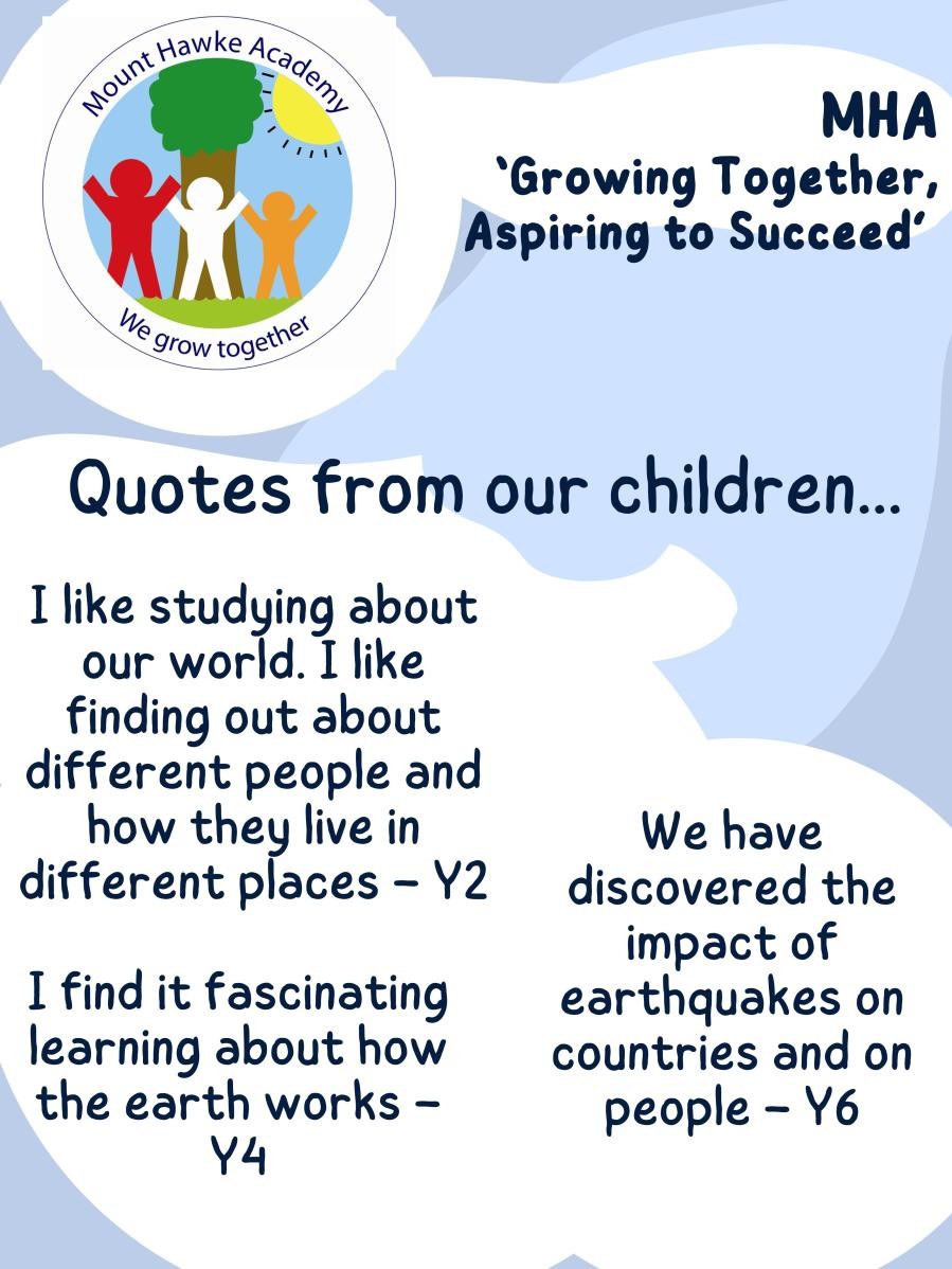 In Geography at MHA, we aim to inspire in our children a curiosity and fascination about the world and its people that will remain with them for the rest of their lives, helping them to make sense of the world, exploring the relationship and interactions between people, place and environment. Â We recognise the importance of Geography to enable our children to understand these relationships between places, the human and physical processes that shape them, and the people who live in them.