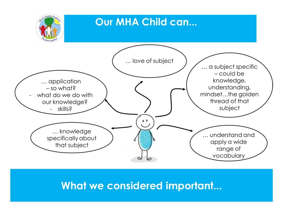 As part of building our MHA curriculum we thought very carefully about what our building blocks are, and have compiled these for each subject, following the image at the bottom of this page. Our MHA Child Can...aspirations and aims for each subject are available on each subject's page.